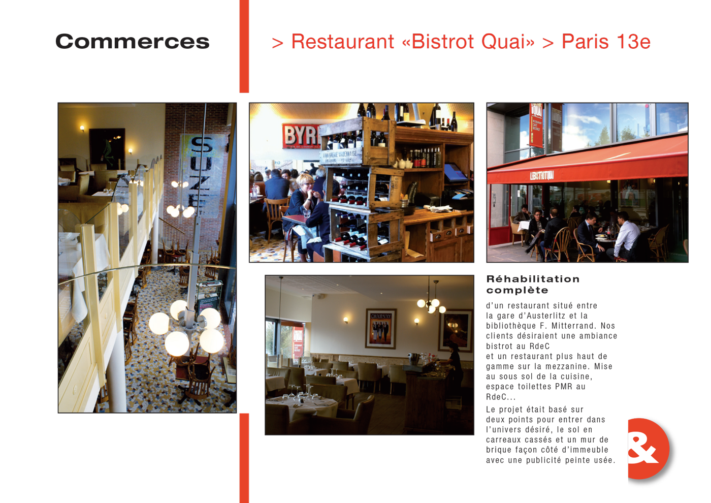- Concept de restaurant situé entre la gare d’Austerlitz et la bibliothèque F. Mitterrand. Nos clients désiraient une ambiance bistrot au RdeC et un restaurant plus haut de gamme sur la mezzanine. Mise au sous sol de la cuisine, espace toilettes PMR au RdeC…