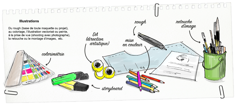 Du rough (base de toute maquette ou projet), au coloriage, l‘illustration vectorisé ou peinte, à la prise de vue (shooting avec photographe), la retouche ou le montage d‘images, etc.